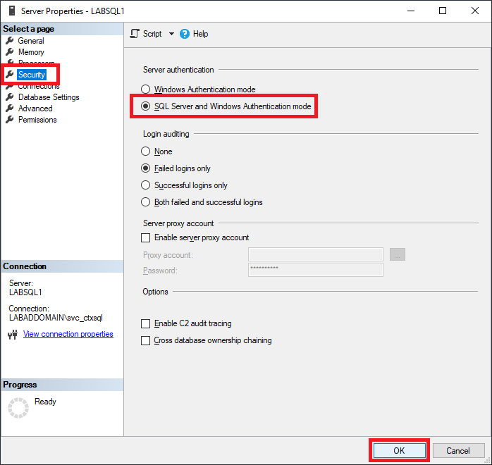 We need a Microsoft SQL database for the Connection Server’s events database. The SQL Server must use SQL Server and Windows Authentication mode.