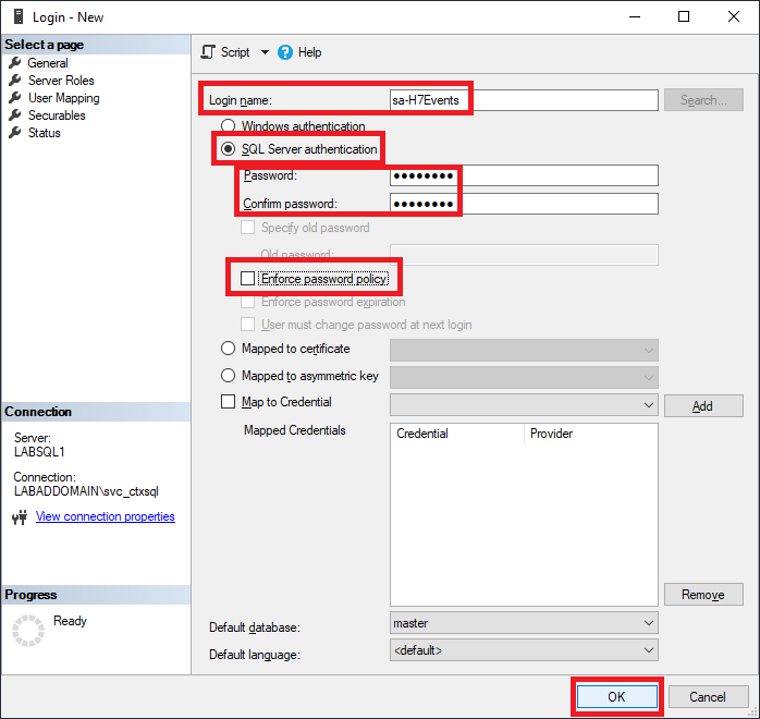 As shown in Figure 4, enter a Login name, select SQL Server authentication, enter and confirm a Password, deselect Enforce password history, and click OK.