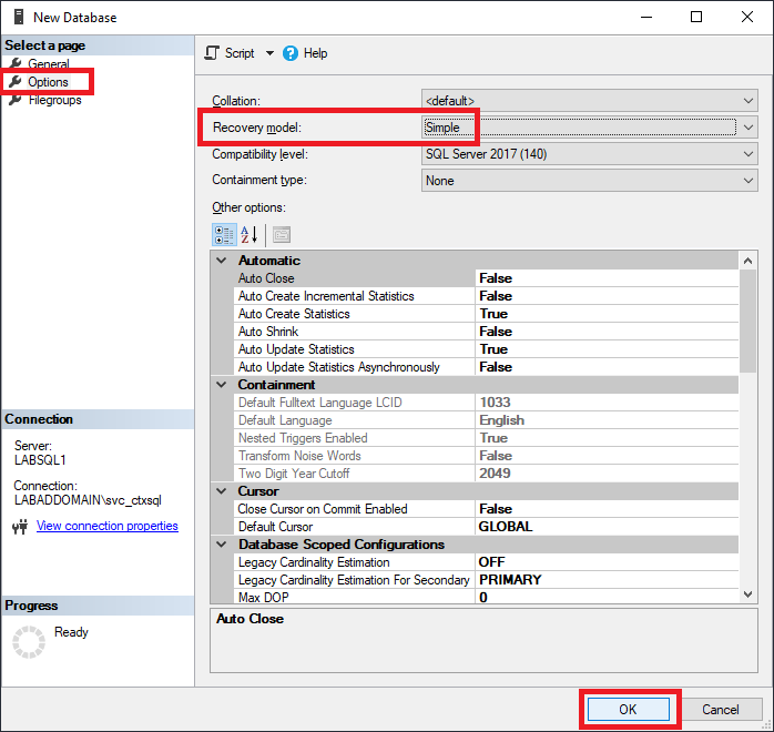 In the left frame, click Options, change the Recovery model to Simple, and click OK, as shown in Figure 8.
