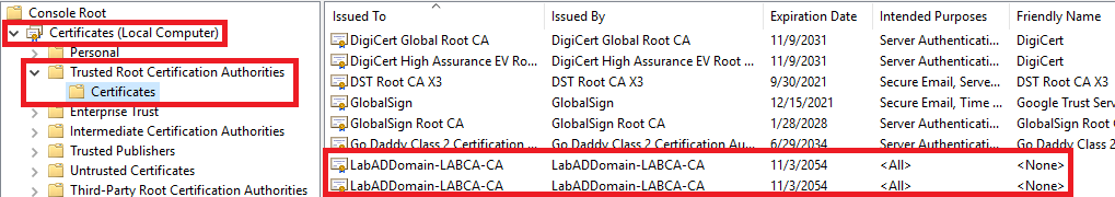 Expand Certificates -> Trusted Root Certification Authorities -> Certificates. Figure 10 shows the domain’s Root certificates.