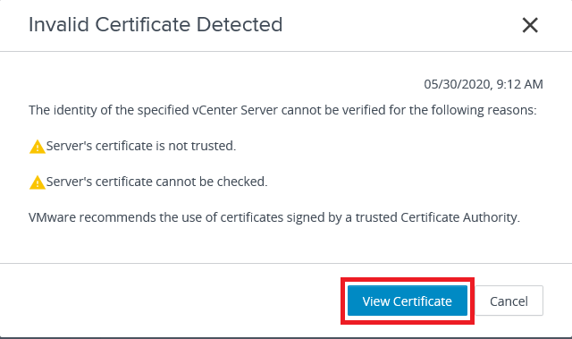 My vCenter uses the default self-signed certificate. Click View Certificate, as shown in Figure 40.