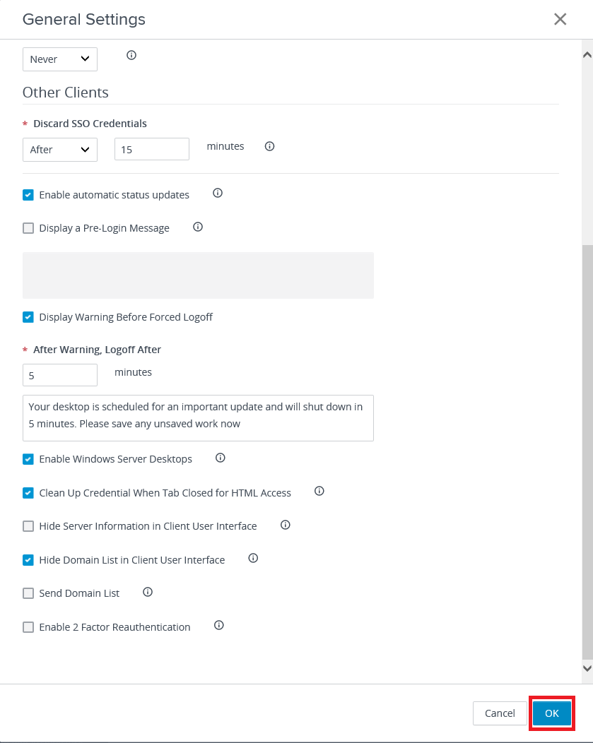 I changed the View Administrator Session Timeout to keep the console from timing out while taking screenshots. I also selected: