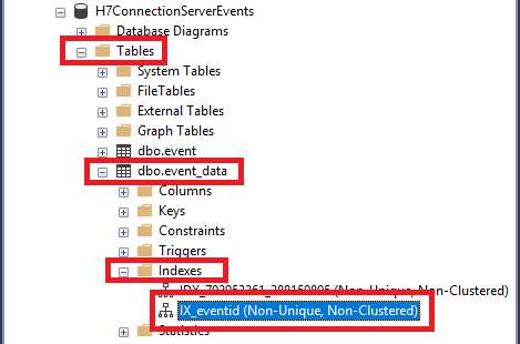 As shown in Figure 63, expand the dbo.event_data Table, expand Indexes, and the new IX_eventid Index shows.
