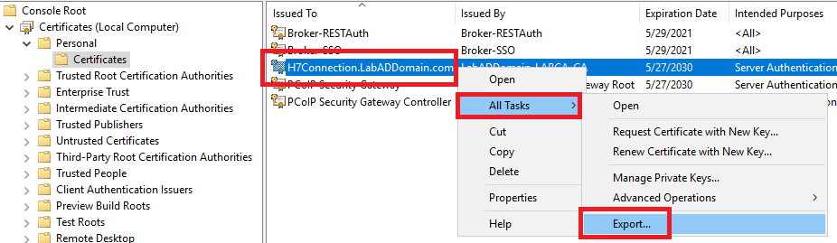 The domain’s Root and Intermediate certificates and a personal certificate automatically install on the Connection Server with a Group Policy.
