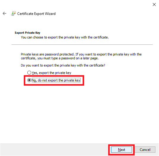 Select No, do not export the private key, and click Next, as shown in Figure 68.