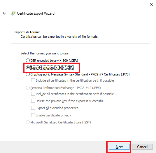 Select Base-64 encoded X.509 (.CER), and click Next, as shown in Figure 69.