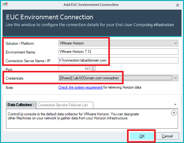 Select VMware Horizon for the Solution/Platform, enter an Environment Name, enter the Connection Server Name/IP, select the Credentials to authenticate to the Connection Server, and click OK, as shown in Figure 82.